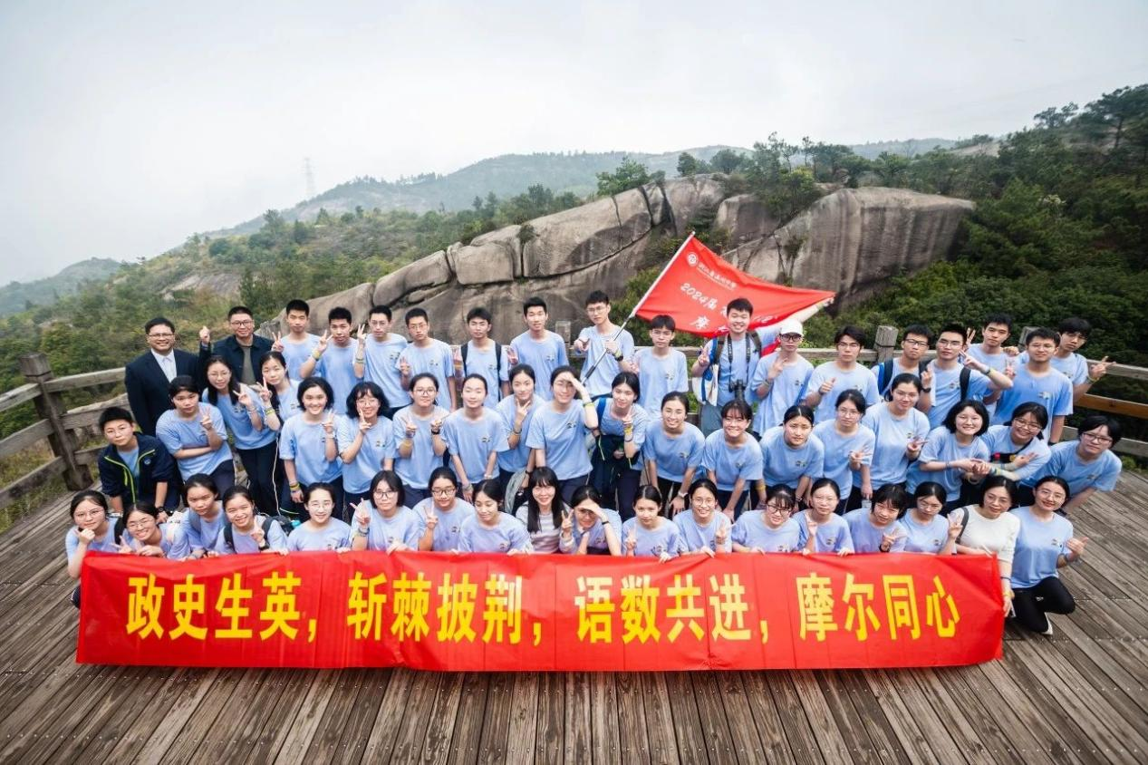 林孙成副校长以著名数学家谷超豪校友的成长历程为例,并引用谷超豪校友写给青年的寄语,阐释成人的内涵,向高三学子表达期许与祝福。吴时月副校长、段长对同学们提出成长的三条建议:“要自信、要扎实、要拼搏”。温州中学党委书记、校长吴军老师为各班代表授予班旗,各班在班长的带领下响亮地喊出班级口号在启程仪式后,高三同学分两批次从大罗山山麓出发,途径五美景园、罗丰古村、龙王寺水库、红枫古道,到达龙脊观景台。