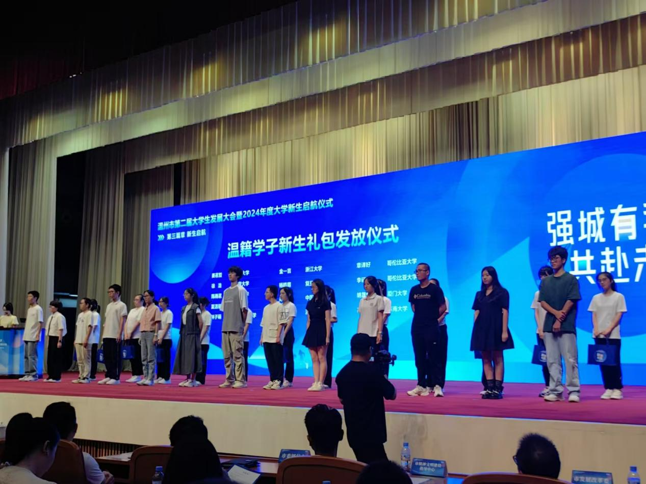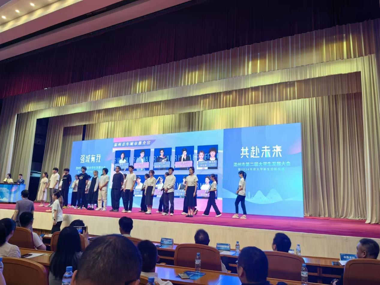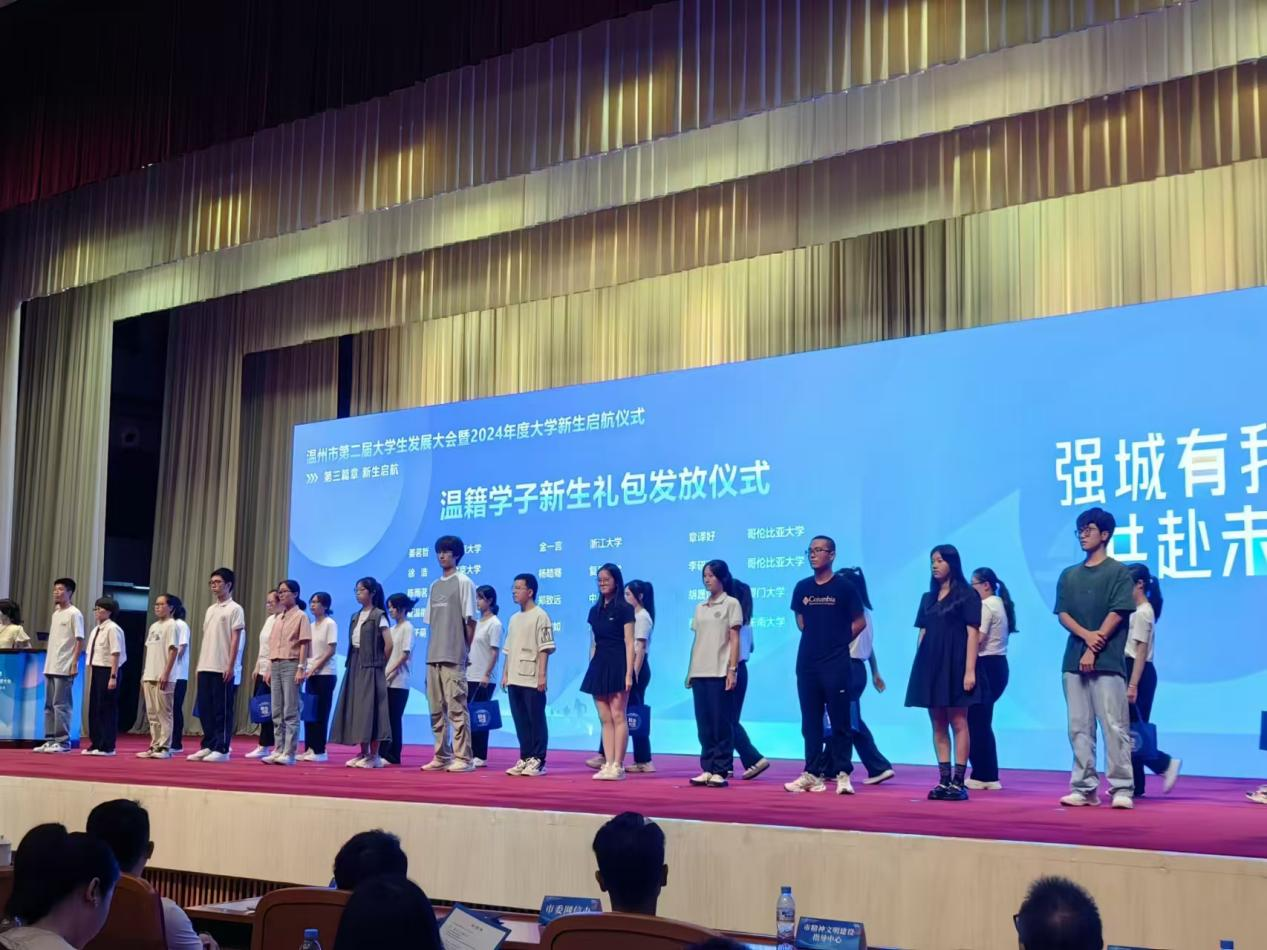 2024 年 8 月15日第二届温州大学生大会暨2024年度大学新生启航仪式在温州人民大会堂举行。我校有6名应届毕业生(分别考上北大、上交大、复旦、浙大)作为学生代表上台接受礼包发放,并有20余名应届毕业生参加大会。值得一提的是,我校23届毕业生董艺同学被市政府邀请作为温州青年城市推荐官。