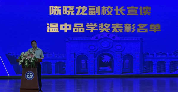 陈晓龙副校长宣读“温中品学奖”表彰名单,并与金长林校长、施晓武副校长一同为获奖同学颁奖。当获奖同学们从校领导手中接过奖状时,相信他们一定能承载着“英奇匡国,作圣启蒙”的校训奔向远方。